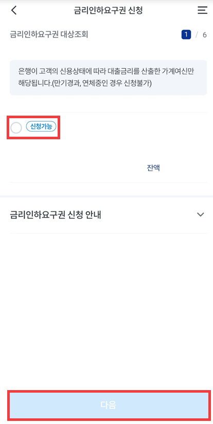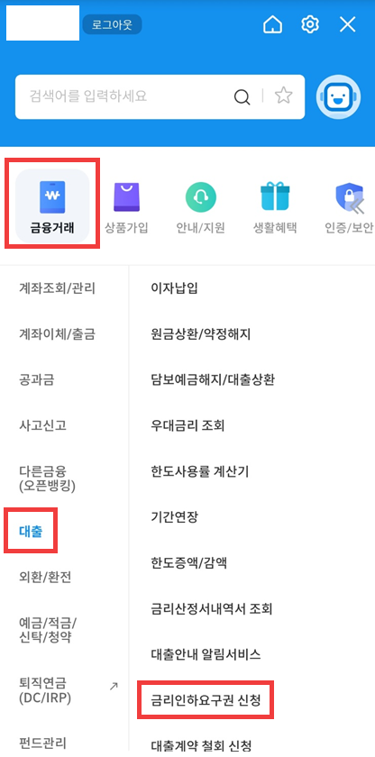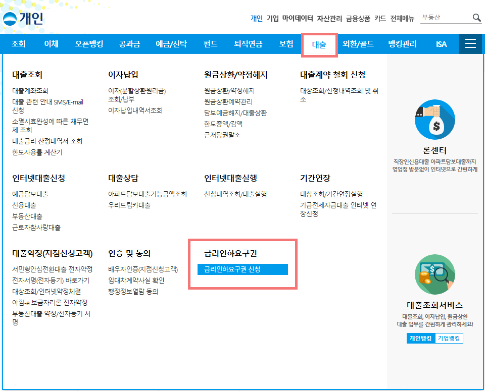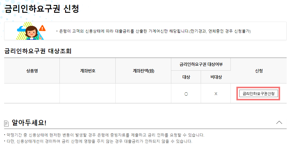 아래 버튼을 통해 우리은행 홈페이지에 로그인을 한 뒤 금리인하요구권 신청 메뉴로 들어가면 대상여부와 신청이 한 번에 가능합니다.