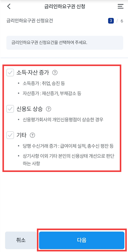①소득ㆍ재산 증가: 취업, 승진, 자산 증가, 부채 감소 등 개인의 재무 상태가 개선된 것으로 판단되는 경우